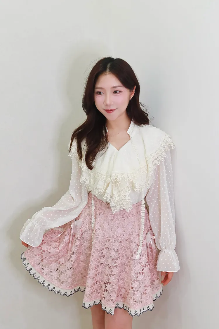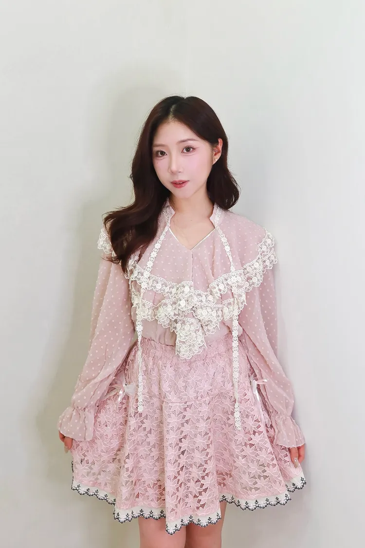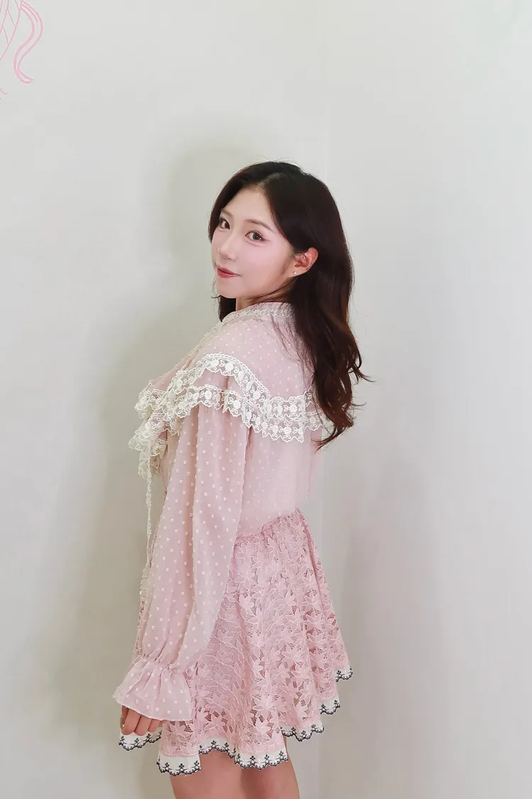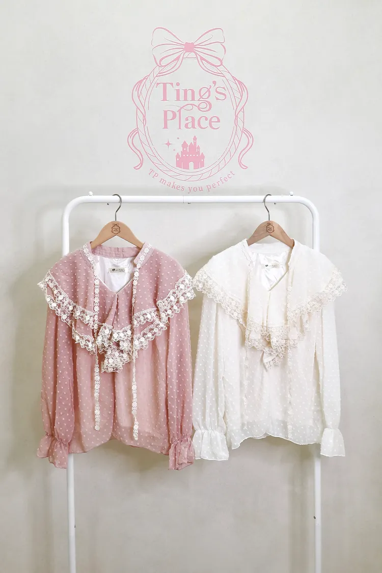 E06點點雪紡蕾絲小V領襯衫