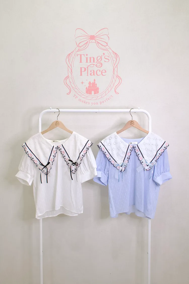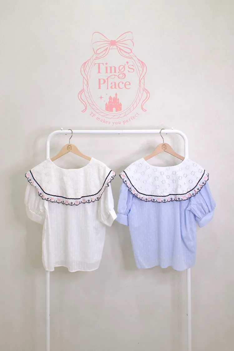 學院風大尖領布蕾絲上衣