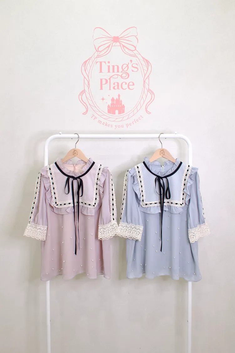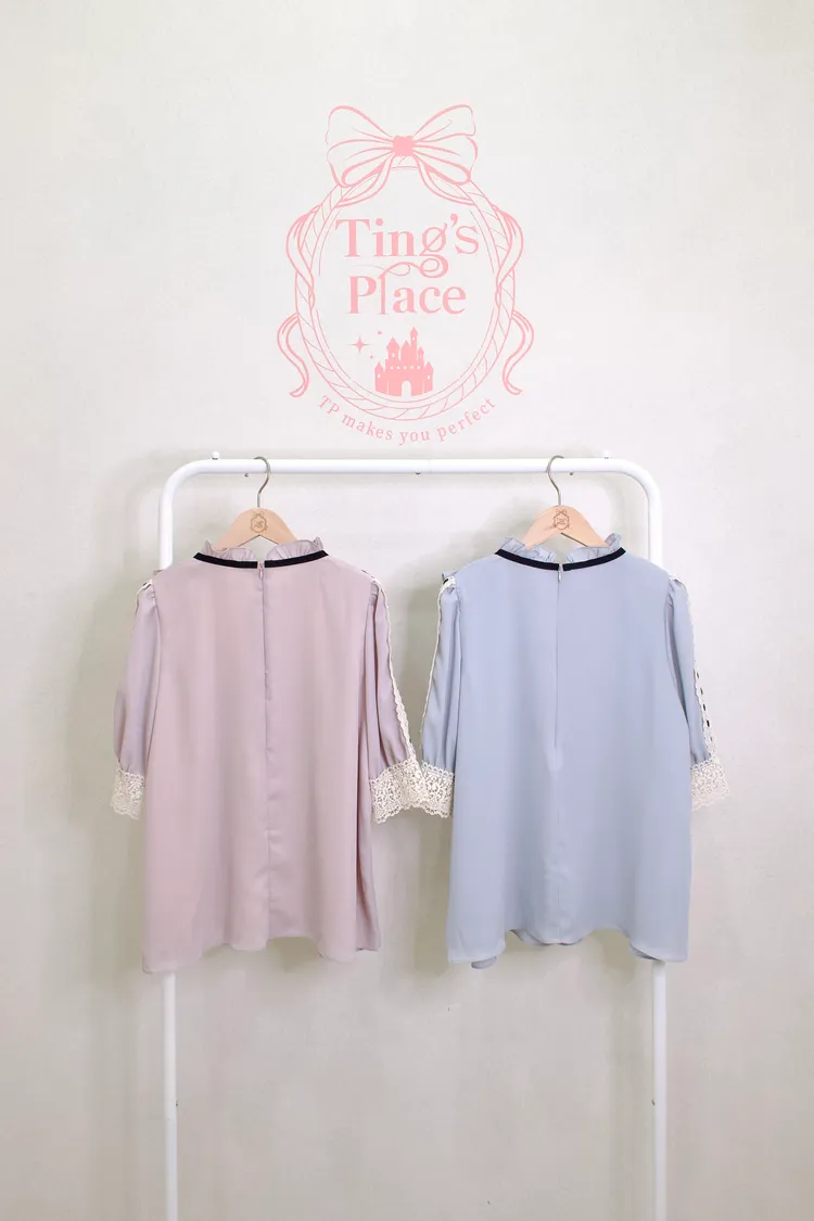 雪紡珍珠蕾絲領綁帶上衣